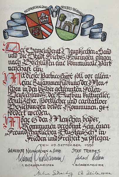 Die DDR-Verwaltungsstrukturen hatten in den Rathäusern ausgedient und freiheitlich-demokratische Strukturen mussten zügig eingeführt werden. So entschied sich Triebes durch die Verbindung zu Neunkirchen dort um Unterstützung zu bitten. Aus dieser Hilfestellung ging letztendlich die bis zum heutigen Tage bestehende Städtepartnerschaft hervor.